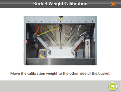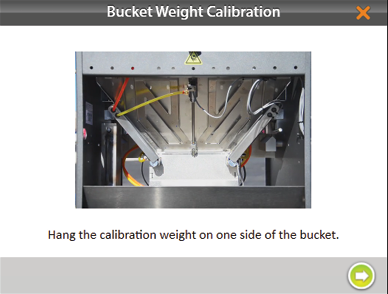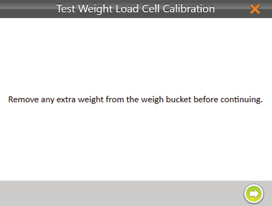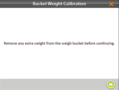 Use the weight calibration wizard and the larger weight (11 lb (5 kg)) included with the GrainGage to calibrate the weigh bucket load cells.