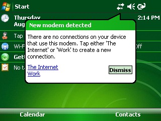 When a card device is inserted into the Field PC, the Connection Manager displays a pop-up "New Modem Detected" message similar to the one shown in the following image.