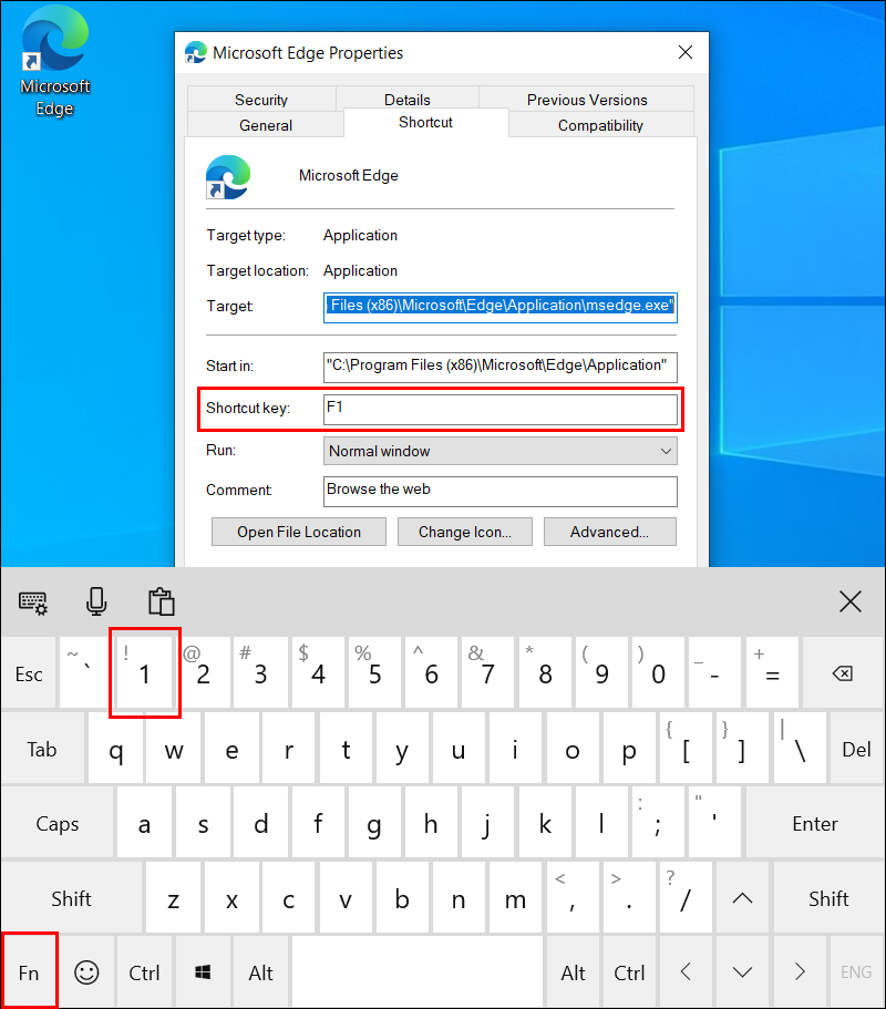 Under the Shortcut tab in the Shortcut key field, type a function key from F1 to F12.