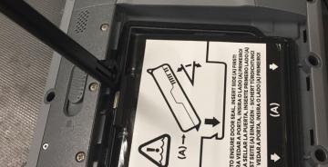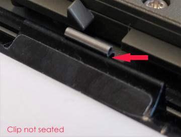 When this modification is present, it may be difficult to fully close and open the door if exact steps are not followed when initially inserting the battery. You must ensure that the retention clip is fully seated over the battery before attempting to close the door. The following images show an unseated and a seated battery retention clip.