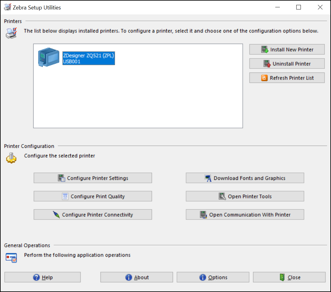 On the Zebra Printer Utilities screen under Printers, verify the correct printer is selected.