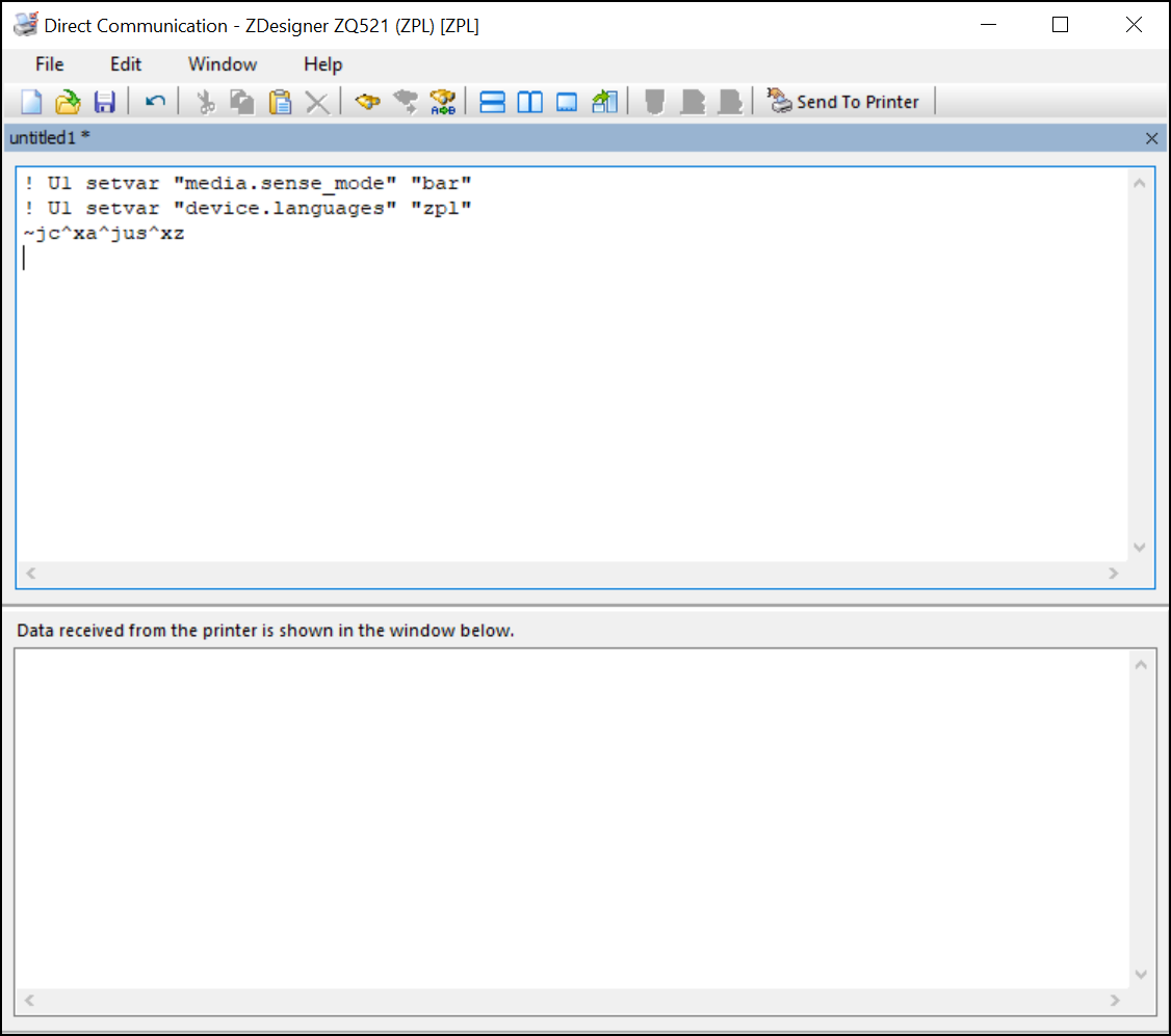 If the printer prints random characters, it could be the default. To change the code language to ZPL, enter the following: