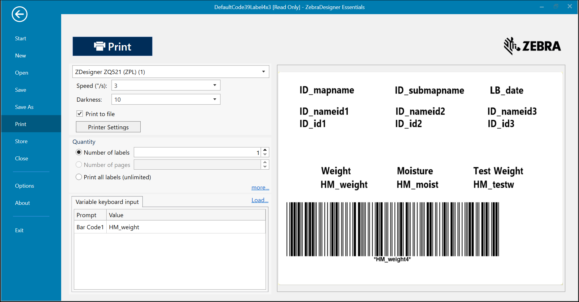 - Enter Harvest and use F3 to print a test label to verify the printer works as expected.