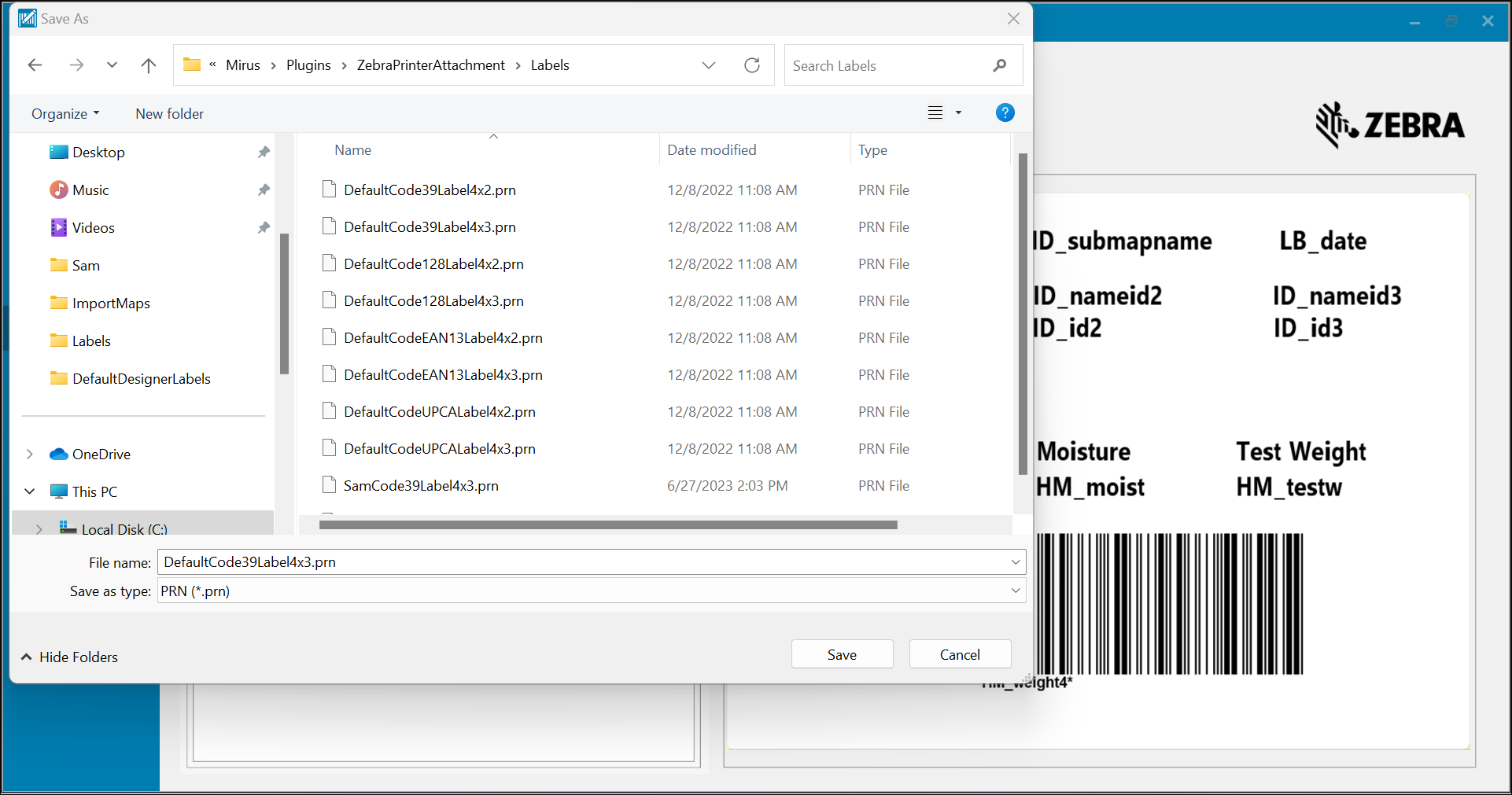 Confirm the file is saved at C:\HarvestMaster\Mirus\Plugins\ZebraPrinterAttachment\Labels.