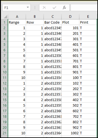To specify if a plot should print a specific value, place that value in the print column for that plot. In the example below, we use "T." Leave the column blank for plots you don't want a printed label for.