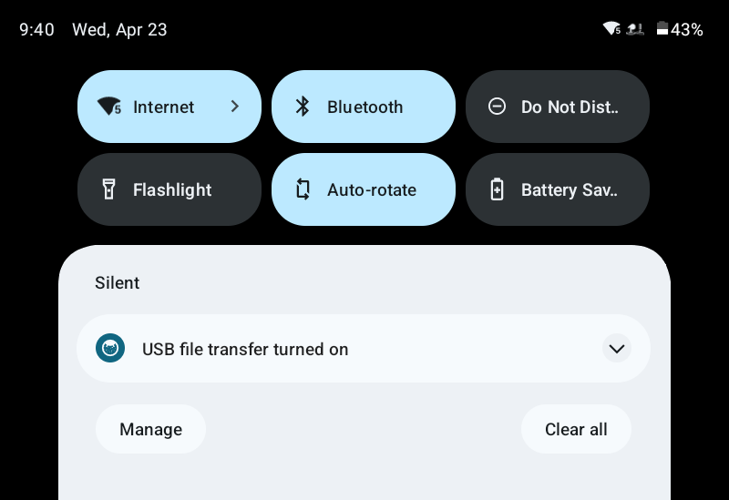 Expand USB file transfer turned on. Then, tap for more options.
