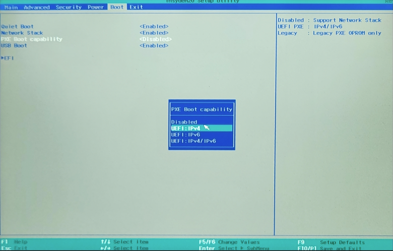 - Select EFI PXE 0 for IPv4 (MAC Address here). Press enter. The available options are
