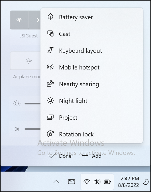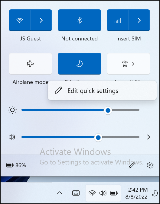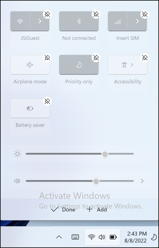 The notification center, on the right side of the taskbar, contains app notifications and the quick settings panel. Use the quick settings panel to access basic settings, such as battery status, screen brightness, and volume control. You can customize the quick settings panel to fit how you use the tablet.