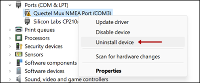 Check the COM ports shown in the Device Manager. If two ports show the same number, usually COM3, manually reassign the COM port for the Quectel Mux NMEA Port.