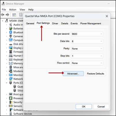 - Check the Port. Consider this port to be in use, regardless of whether or not it shows in use in the Device Settings. Do not pick this COM port for the Quectel Mux NMEA Port.