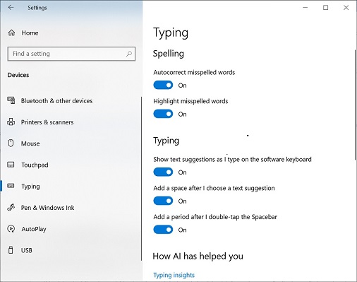 In the Microsoft Windows 10 operating system (such as on our Mesa 3 Windows model), this can be enabled under Start > Settings > Devices > Typing in the Spelling and Typing sections as shown below.