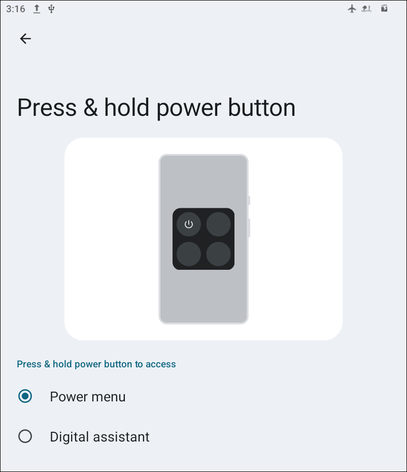 Starting with Android 14, pressing the Power key activates the digital assistant by default. In earlier versions, pressing the Power key opened the Power menu with options for Power off, Restart, or Shutdown.