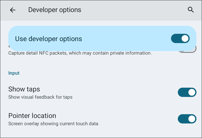 - Under Input, turn on Show taps and Pointer location.