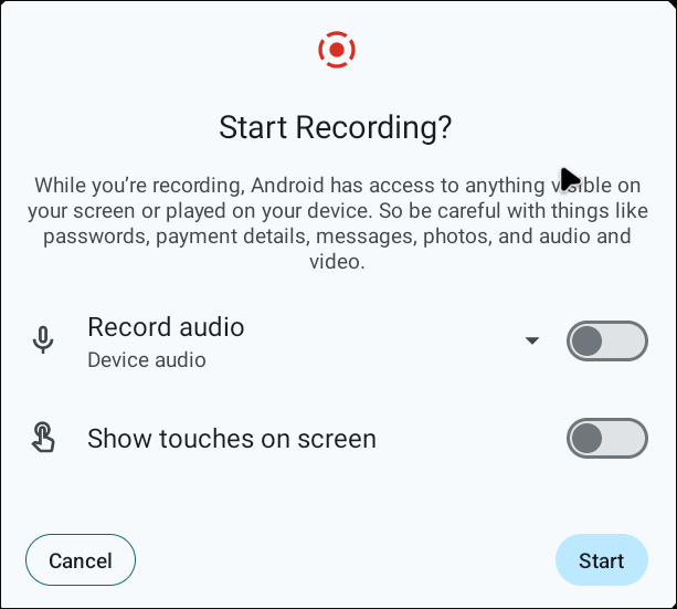 - Click Screen record start. (You may need to navigate to the next screen to see this option.)