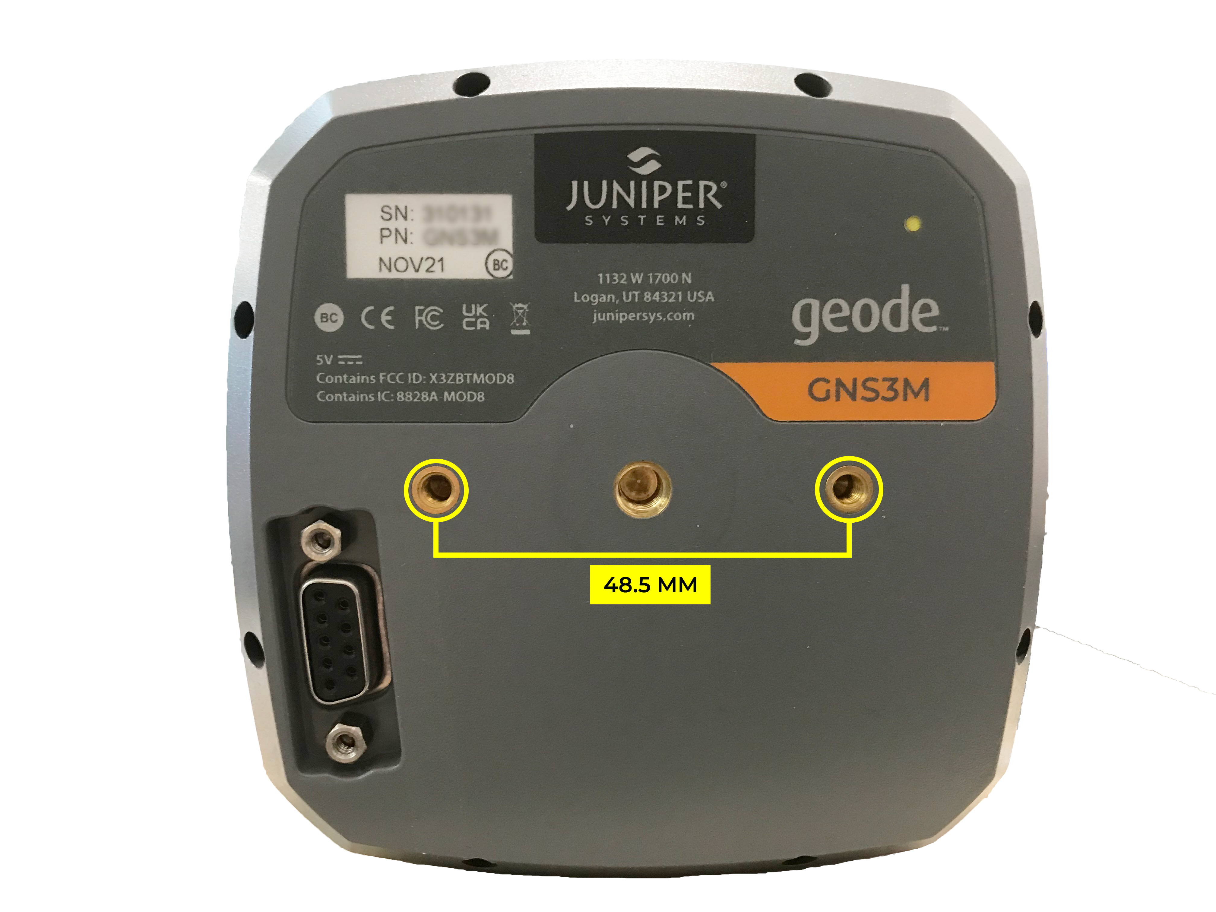 Geode comes with a 1/4”-20 to 5/8”-11 brass adapter. Screw the adapter into the center mounting hole to connect the Geode to a camera tripod or standard 2 m survey pole. To avoid damage to the case, the max screw depth for the center mounting hole is 7 mm (0.3 in.). For a detailed list of mounting options, see https://blog.junipersys.com/which-geode-carrying-mounting-option-is-best-for-you/.