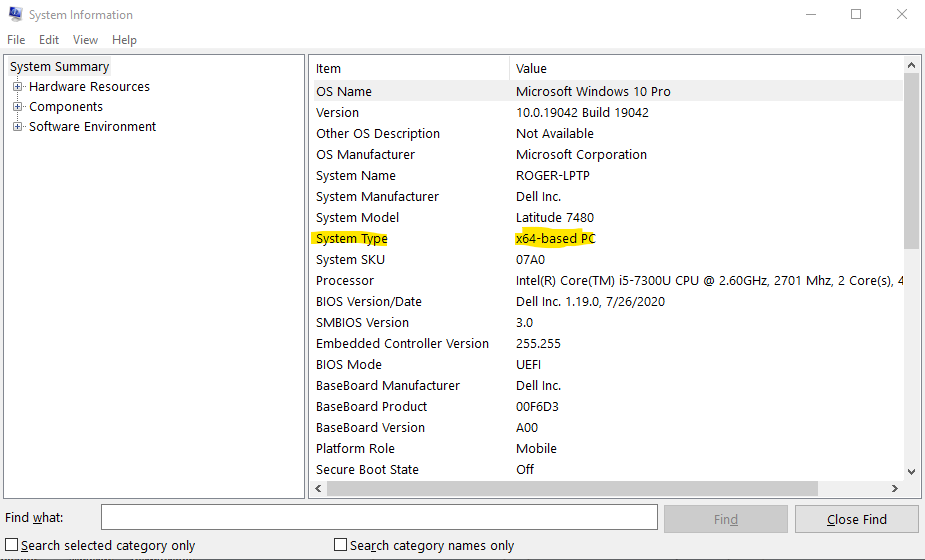 This will open the "System Information" screen and put you in the "System Summary" area. Under the "System Type" entry on the right you will see either "x86- based PC" which is 32-bit or "x64-based PC" which is 64-bit.
