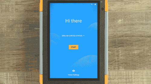 Turn on the device. If you have trouble reading the text on the first screen, the Vision Settings option allows the user to use magnification, different font and display size, select to speak, or talkback.