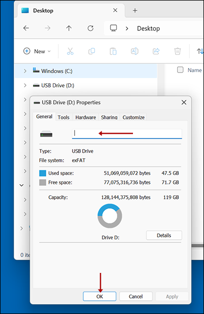 The preferred name will show in File Explorer. The name is stored on the card and will show in File Explorer when used in the future.